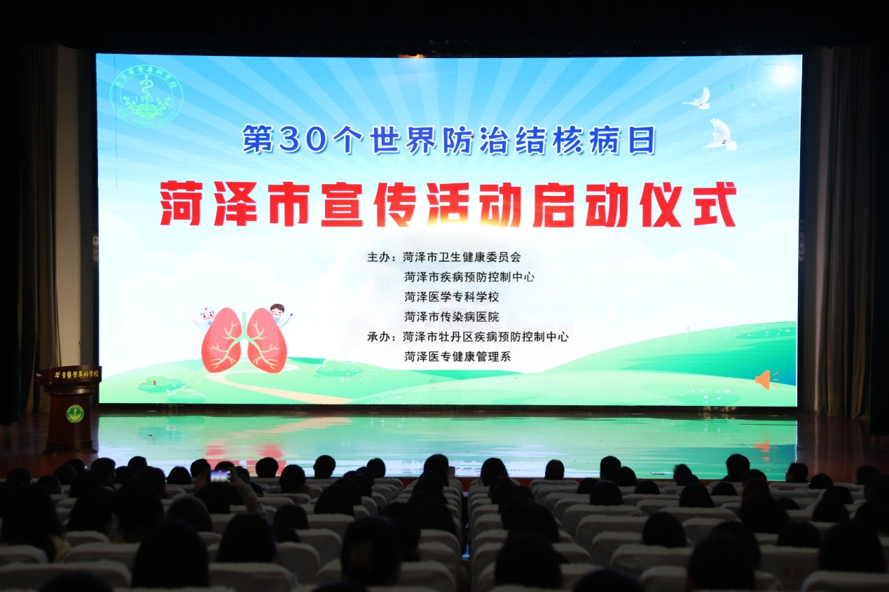 3月24日上午,第30个世界防治结核病日菏泽市宣传活动启动仪式在我校学术报告厅举行。此次活动由菏泽市卫生健康委员会、菏泽市疾病预防控制中心、菏泽医学专科学校、菏泽市传染病医院联合主办,牡丹区疾病预防控制中心、菏泽医学专科学校健康管理系承办。菏泽市卫健委副主任吴大彦,菏泽市疾控中心主任马燕平,校党委委员、副校长齐云飞、郭树榜,市教育体育局、市传染病医院、牡丹区疾控中心、润泽公益服务中心等负责人出席活动,菏泽学院、菏泽职业学院及我校师生志愿者共500余人参加活动。