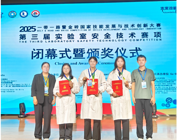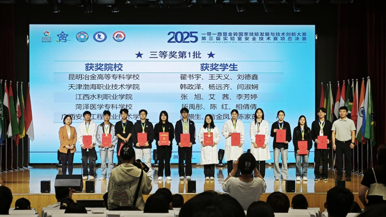 6月20日,2025“一带一路”暨金砖国家技能发展与技术创新大赛之第三届实验室安全技术赛项全国总决赛(高职组)在吉林辽源职业技术学院落下帷幕。在经过此前全国五大赛区预选赛的激烈争夺后,来自全国20个省市45所高职院校进入了全国总决赛。经过3天的激烈角逐,我校由药学与检验系药学专业学生所禹彤、陈红、相倩倩(指导老师夏亚钊、王卫华)组成的团队荣获三等奖(铜牌)。