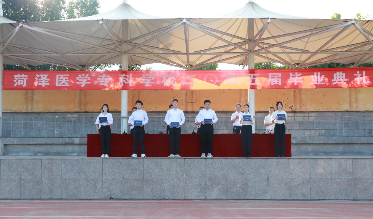 在庄严的国歌声中,毕业典礼正式拉开帷幕。随后,学校党委委员、副校长齐云飞宣读了《菏泽医学专科学校关于颁发2025届毕业生学历证书的决定》,学校党委委员、副校长郭树榜宣读了优秀毕业生表彰决定。学校领导依次为毕业生代表颁发毕业证书,为菏泽医专2025届优秀毕业生代表颁发荣誉证书。每一本证书,不仅是对学业的圆满见证,更凝结着母校沉甸甸的期许与嘱托。