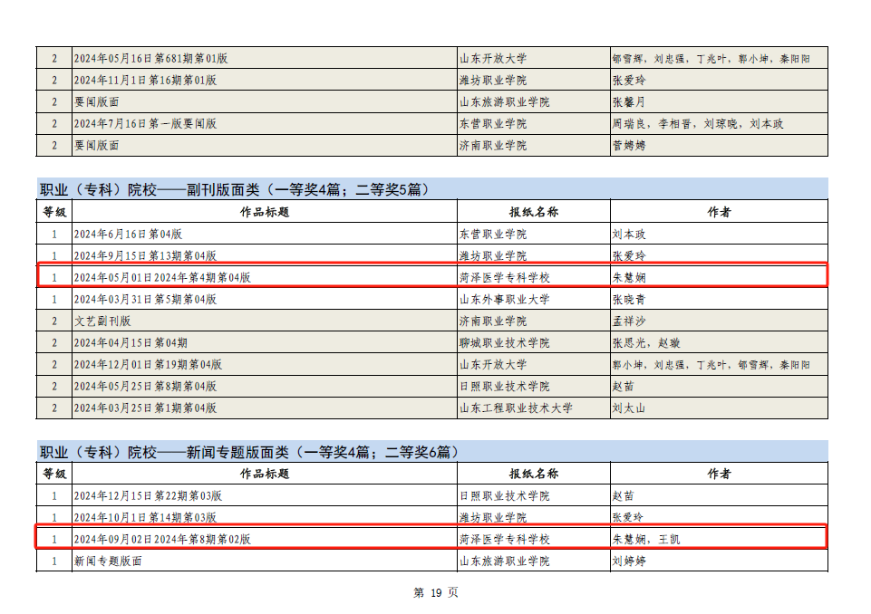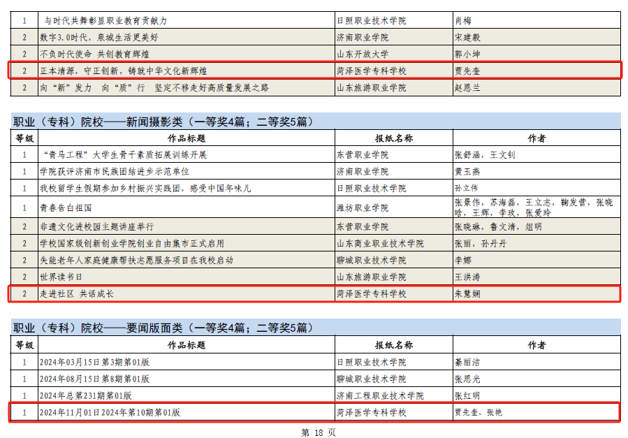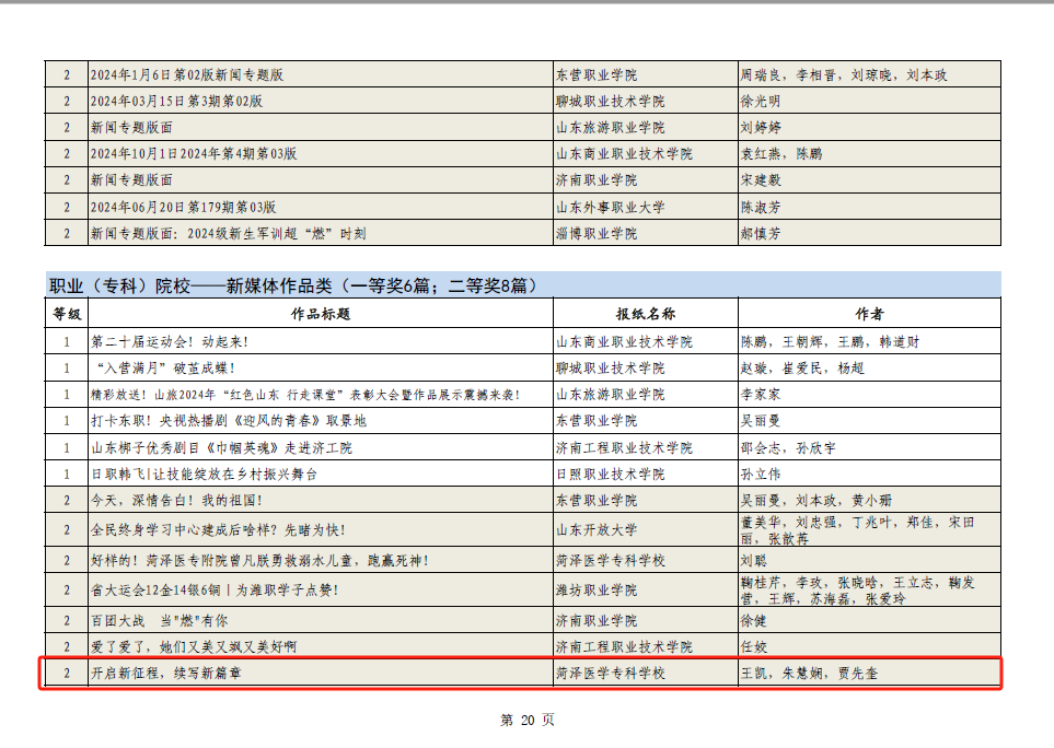 近日,山东省高等学校校报研究会公布2024年度优秀新闻作品奖评选结果,我校在本次评选中斩获7项大奖,包括一等奖3项、二等奖4项,获奖总数位居全省职业院校前列。这是我校连续多年在省级新闻评选中蝉联佳绩。