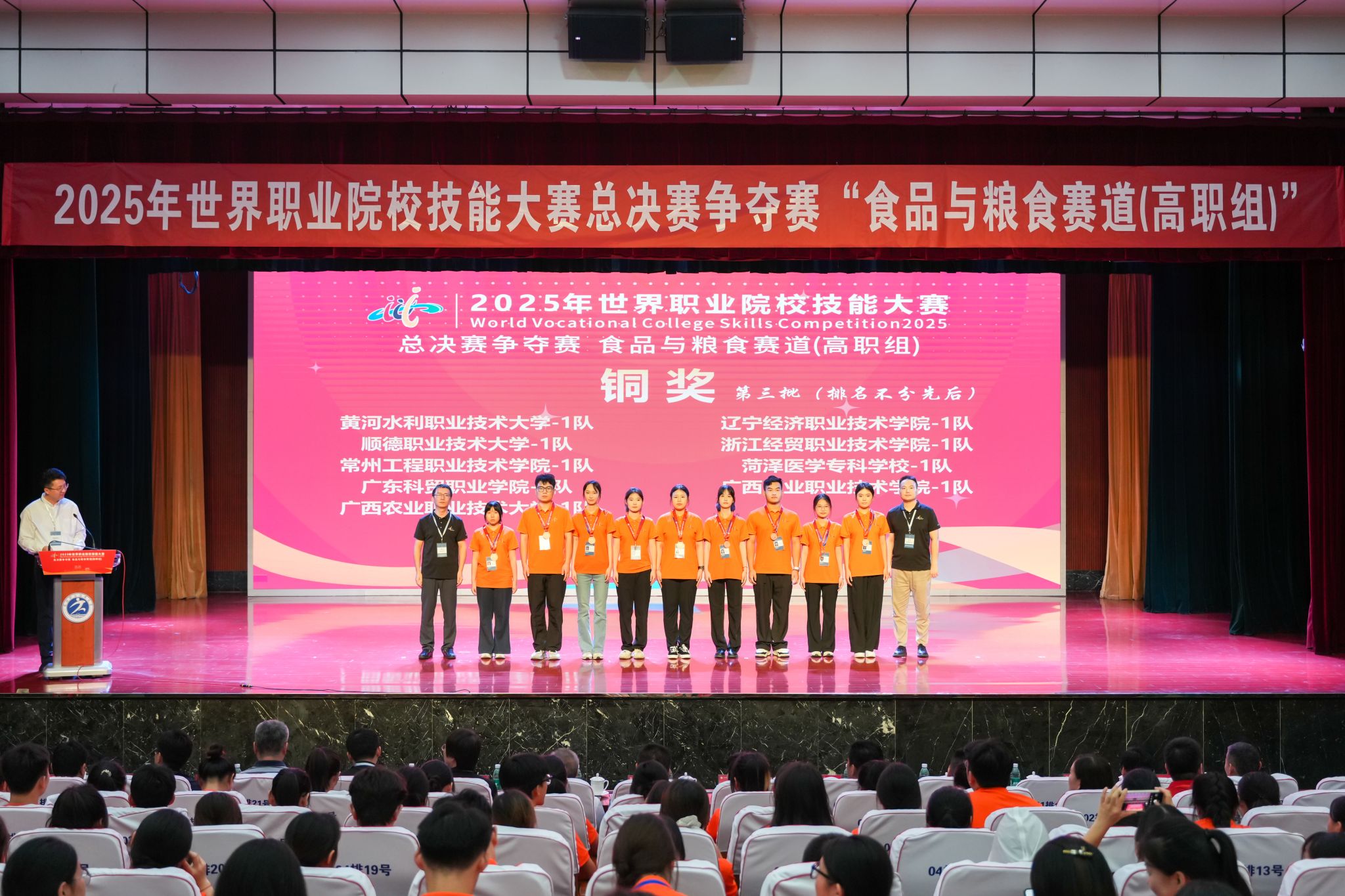 8月22-26日,2025年世界职业院校技能大赛全国争夺赛(高职组)食品与粮食赛道在芜湖职业技术大学落幕。此次赛事汇聚全国31 个省市自治区 94 所高职院校的 100 支代表队、近 800 名师生。我校药学与检验系杨程、张卫敏两位老师指导药学与检验系学生范思含、齐佳宁、郭叶桐组成的代表队,凭借新颖创意、精湛技能与默契协作脱颖而出,斩获铜奖。