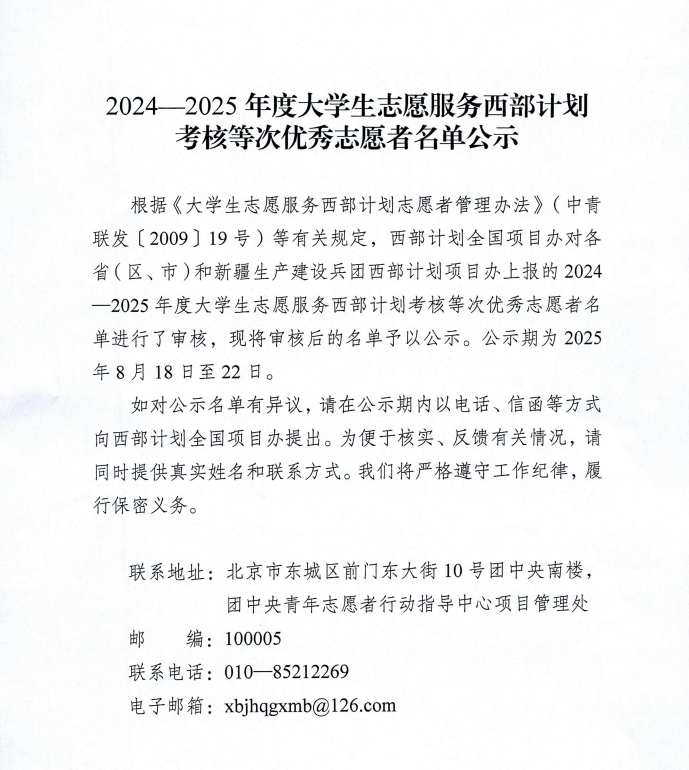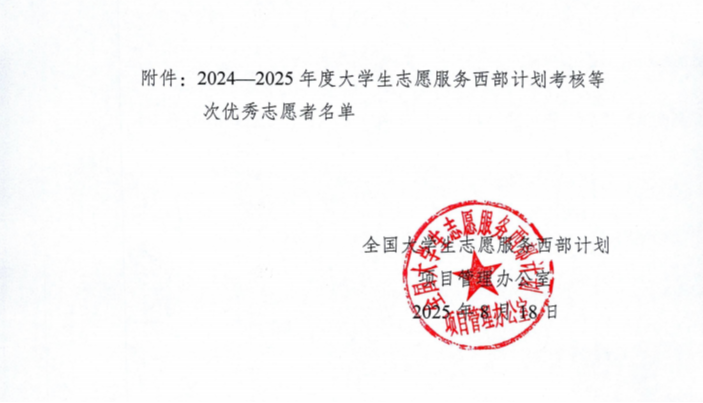近日,全国大学生志愿服务西部计划项目管理办公室发布《2024-2025年度大学生志愿服务西部计划考核等次优秀志愿者名单公示》,我校西部计划志愿者蔡贇获评全国西部计划考核等次优秀。
