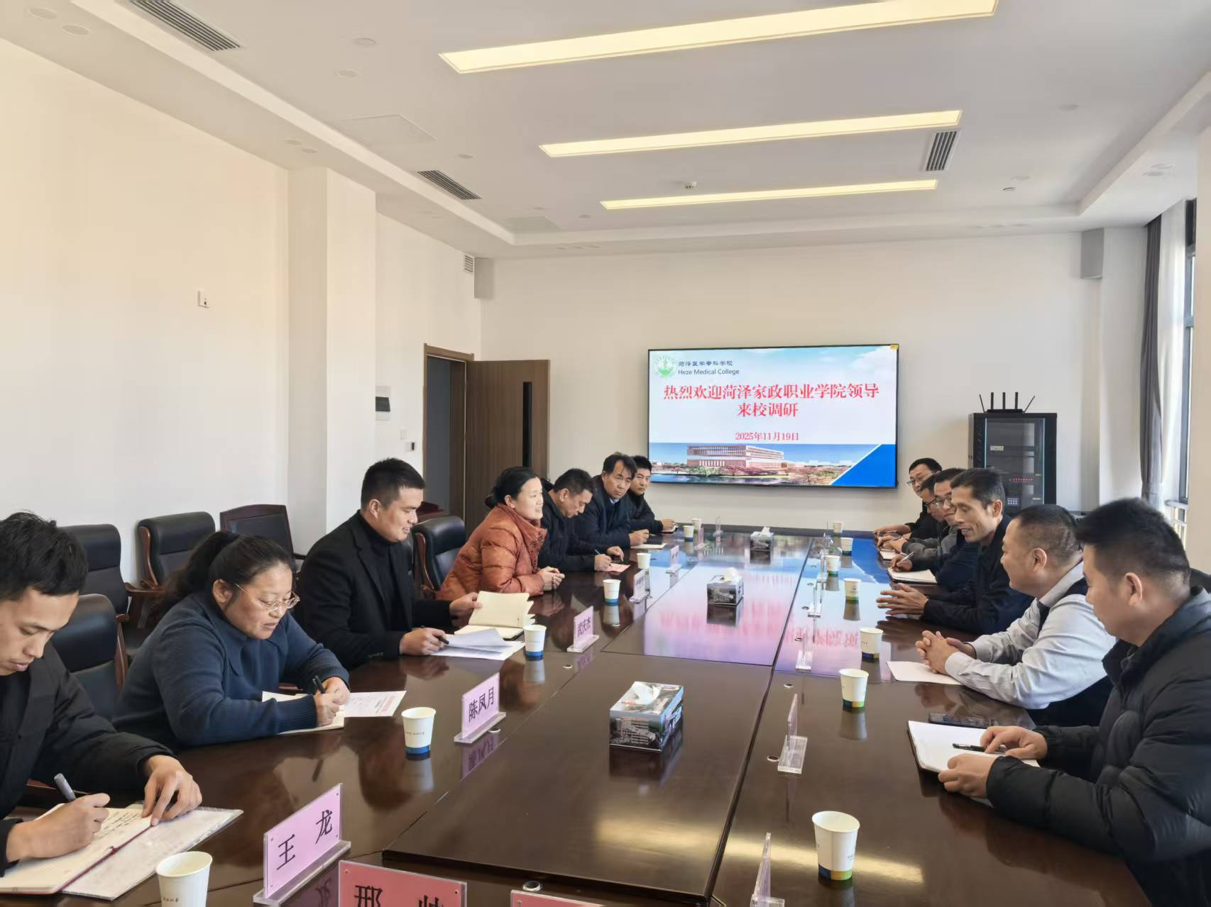 11月19日下午,菏泽家政职业学院党委委员、副院长帅志星一行7人来我校进行调研交流。我校党委委员、副校长代爱英、附属医院副院长苑斌、总务处相关工作人员陪同调研并出席座谈会。座谈会由总务处负责人武庆杰主持。