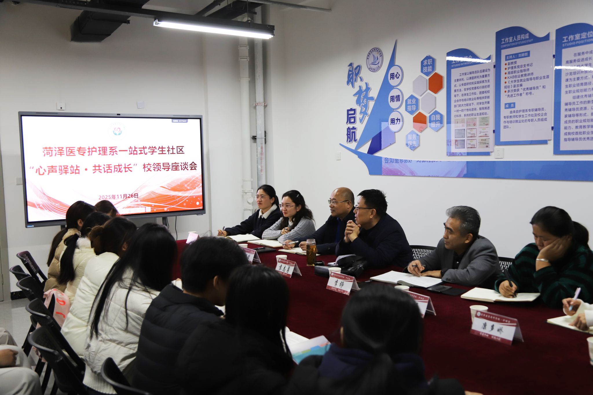 为学习贯彻党的二十大和二十届四中全会精神,落实立德树人根本任务,推动一站式学生社区建设提质增效,精准对接学生成长需求,凝聚校园发展合力,11月26日,校党委书记袁志勇,党委委员、副校长李铮深入护理系一站式学生社区召开“心声驿站·共话成长”座谈交流会,与学生代表共话青春成长、共谋学校发展。护理系党政负责人和辅导员代表一同参与座谈。