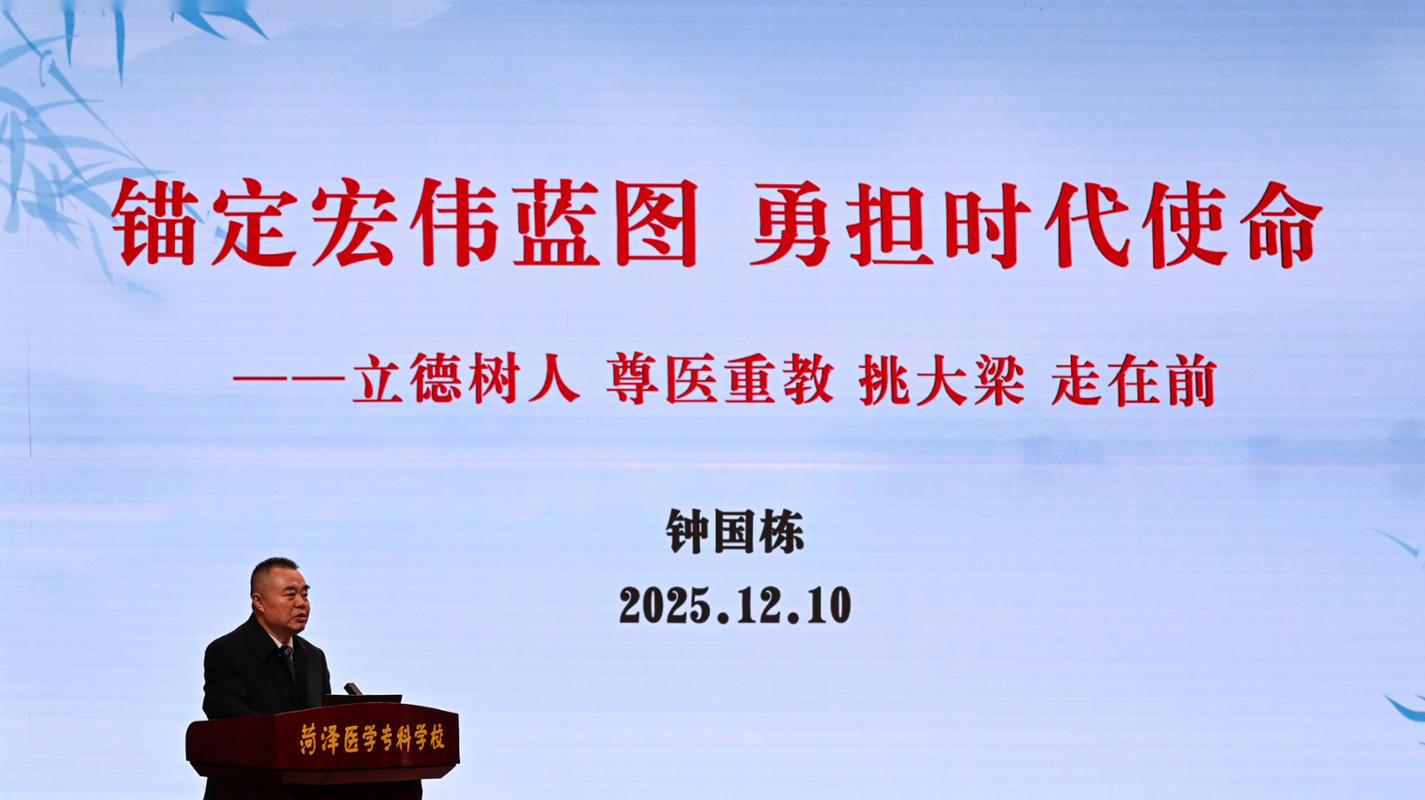 为深入学习贯彻党的二十大和二十届四中全会精神,充分发挥劳模工匠的示范引领和榜样带动作用,12月10日下午,我校特邀全国劳动模范、全国五一劳动奖章获得者、齐鲁工匠、菏泽市博爱医院院长钟国栋开展“劳模工匠进校园 同上一堂思政课”主题宣讲活动,校党委书记袁志勇等学校领导及各二级部门党政负责人、全校师生代表共700余人参加活动。