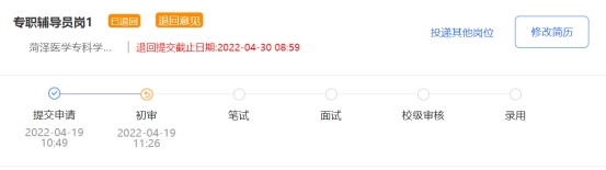 3.收到简历退回修改通知后,请按要求修改。审核结果分为通过、不通过、退回修改。