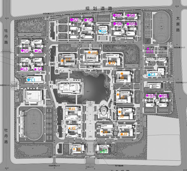 分别为教学楼J1——J11,办公楼B1,学生公寓G1-4、G5-6、G7-10、G11-12(共4组,按组命名),专家公寓G13,学生餐厅C1、C2、C3,平面示意图见附件2;