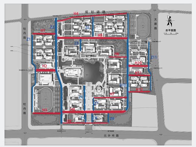1.道路:拟命名道路共23条,分别为南北纵向Z1-11,东西横向H1-12,平面示意图见附件1;