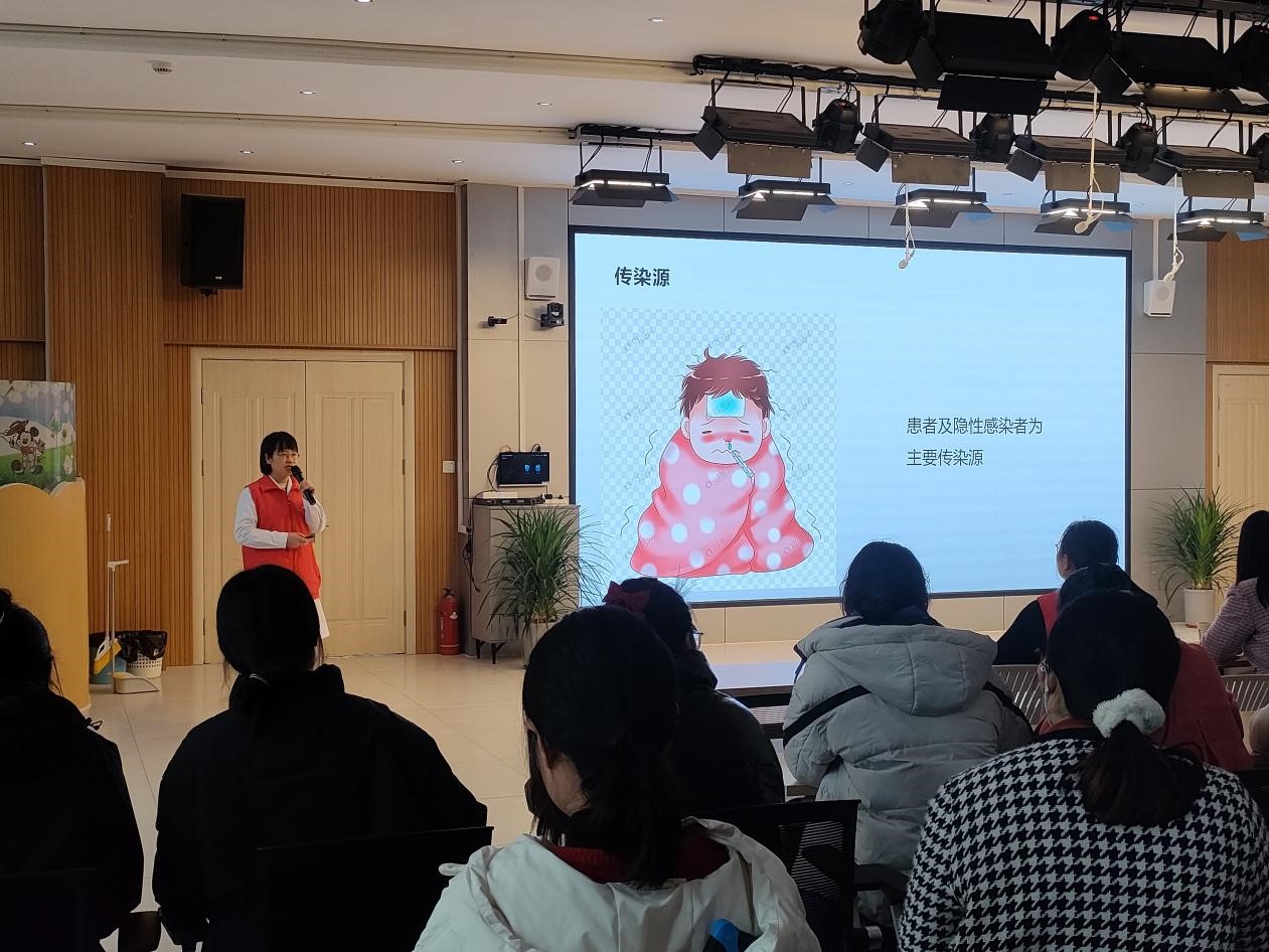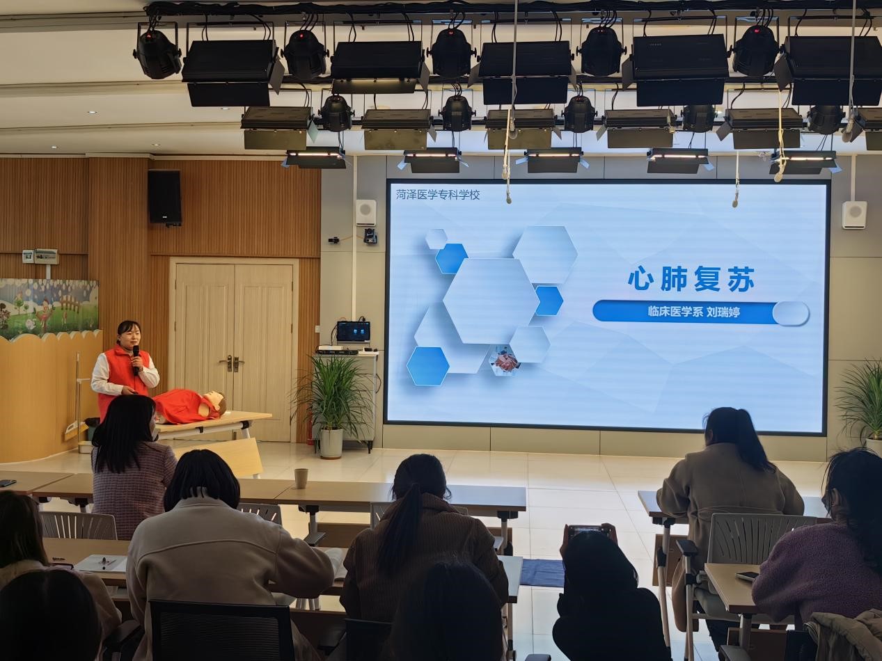 临床医学系党总支书记吴琪向幼儿园教工介绍了学校及系部发展概况、系部党建品牌特色及实践育人成果。儿科学教研室教师卜美玲、内科学教研室教师刘瑞婷分别为幼儿园教师讲授幼儿常见疾病的预防与救治以及健康应急救护知识,主要包含幼儿常见病防治、儿童意外伤害应急处理和心肺复苏术操作技能等。活动最后环节,师生志愿者邀请学员们来到台前,分三组在模拟人身上实践操作心肺复苏术,展示学习成果,接受专业点评,将学习氛围推向高潮。