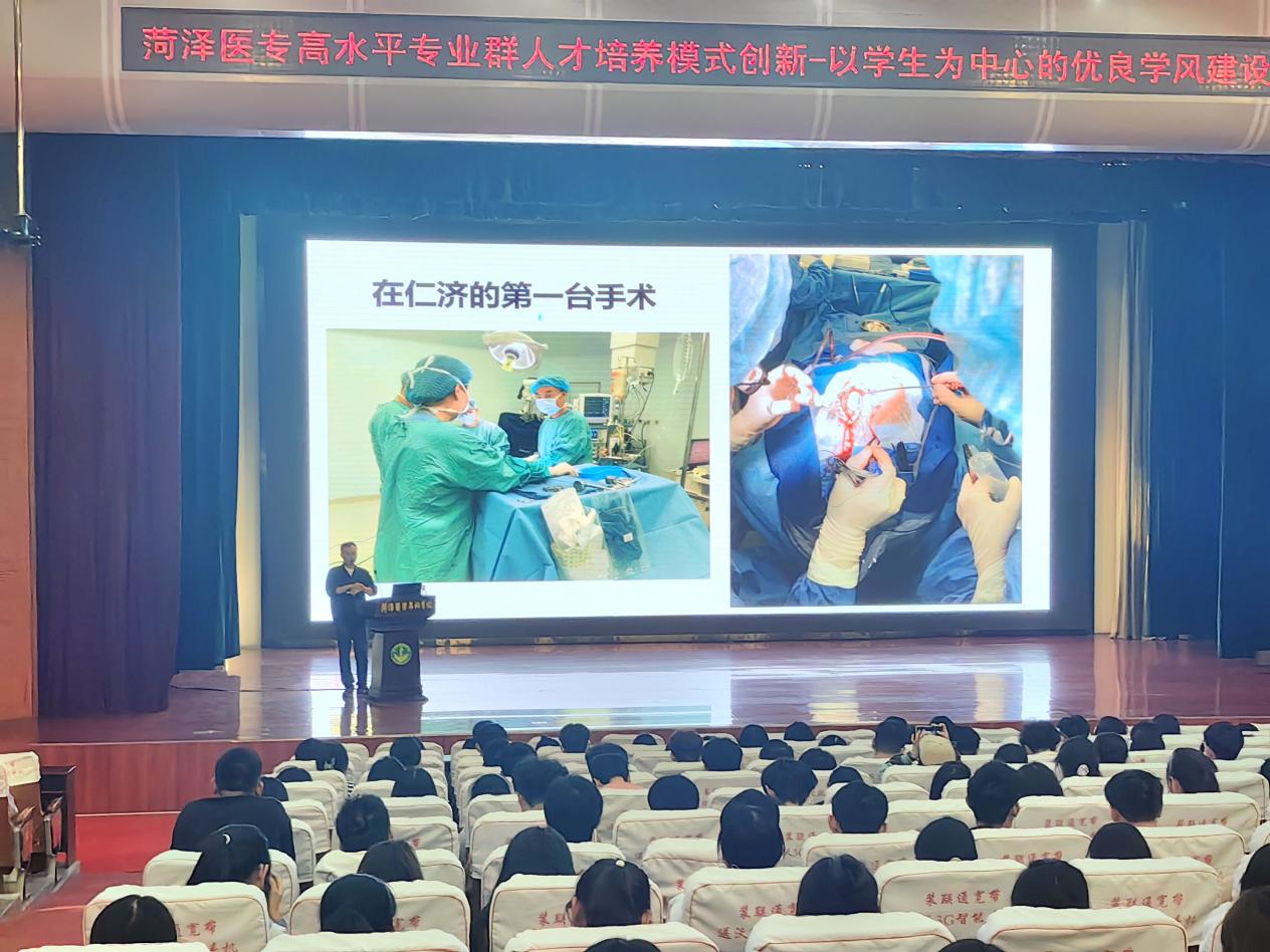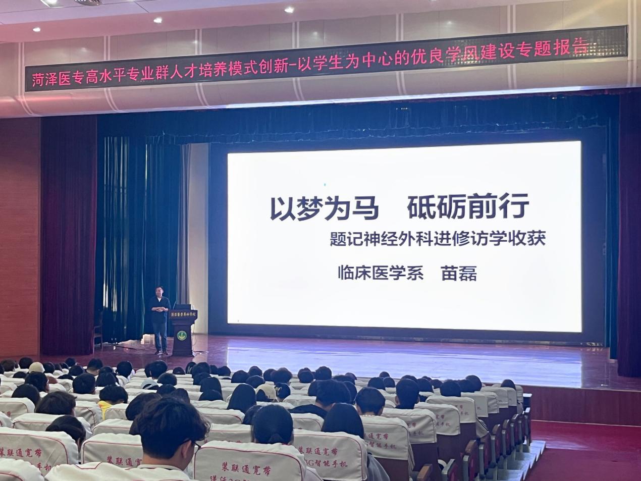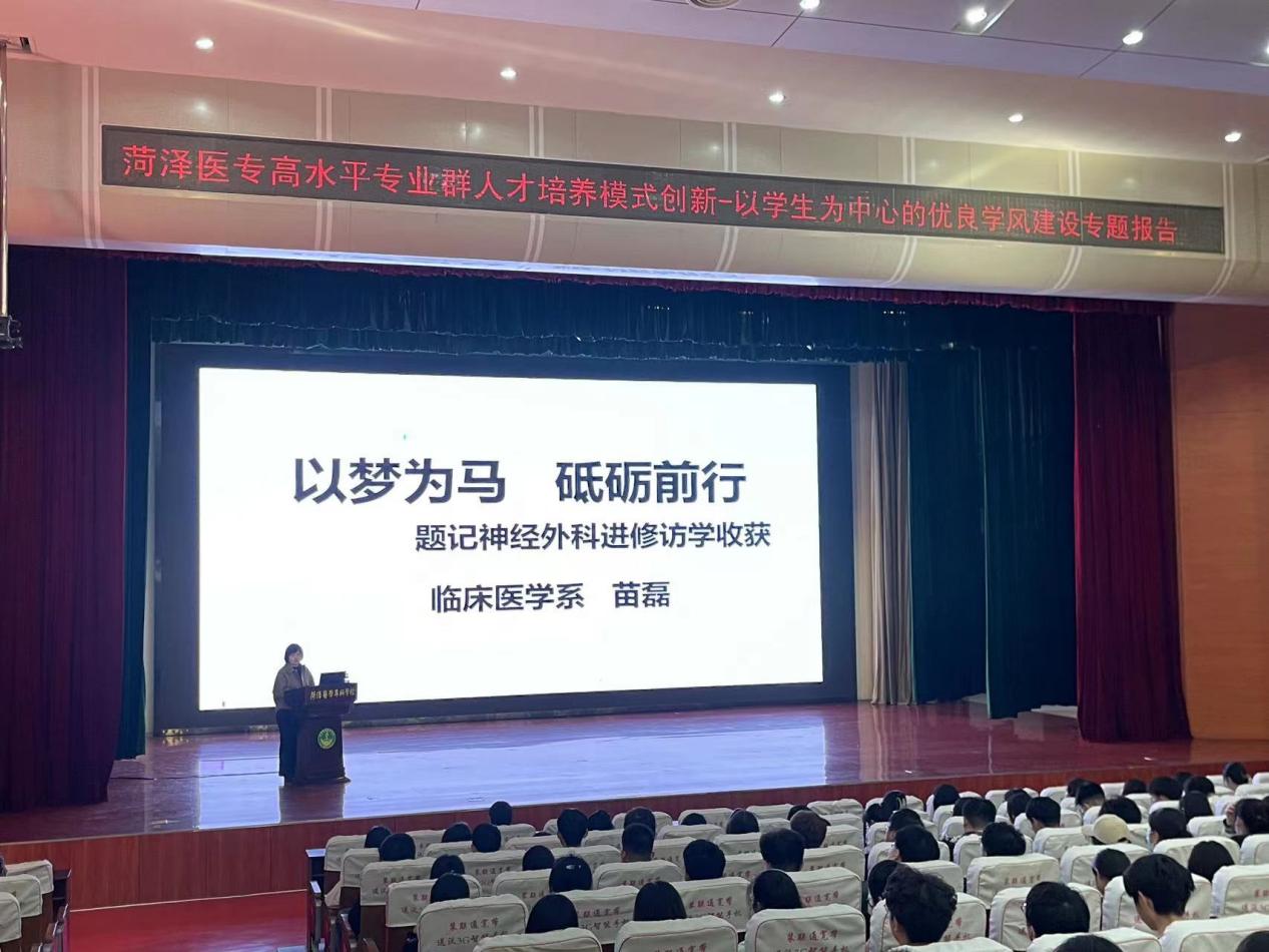 为创新高水平专业群人才培养模式,推进以学生为中心的教学改革及优良学风建设,4月10日下午,教务处联合临床医学系邀请我校进修访学归来的外科教研室苗磊老师,在学术报告厅以“以梦为马,砥砺前行”为题做专题报告。教务处处长代爱英致开场辞,临床医学系部分教师、高水平专业群相关专业学生近400人参加报告会。