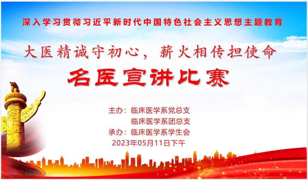 为推进文化润校发展战略,将主题教育融入到医德医风建设活动,5月11日下午,临床医学系在学术报告厅举办“大医精诚守初心,薪火相传担使命”名医故事演讲比赛。