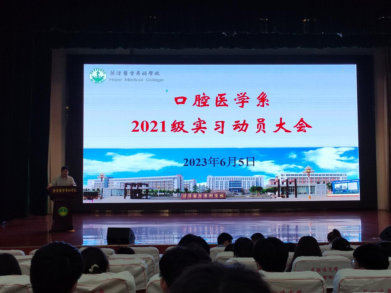 为推动习近平新时代中国特色社会主义思想主题教育深入开展,扎实做好口腔医学系2021级学生实习工作,提高技术技能人才培养质量,6月5日下午,口腔医学系在学术报告厅召开2021级实习动员大会。口腔医学系党总支书记司景方、副书记吕继忠,专职辅导员及2021级和2022级全体学生参加了本次会议。