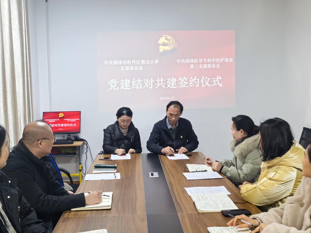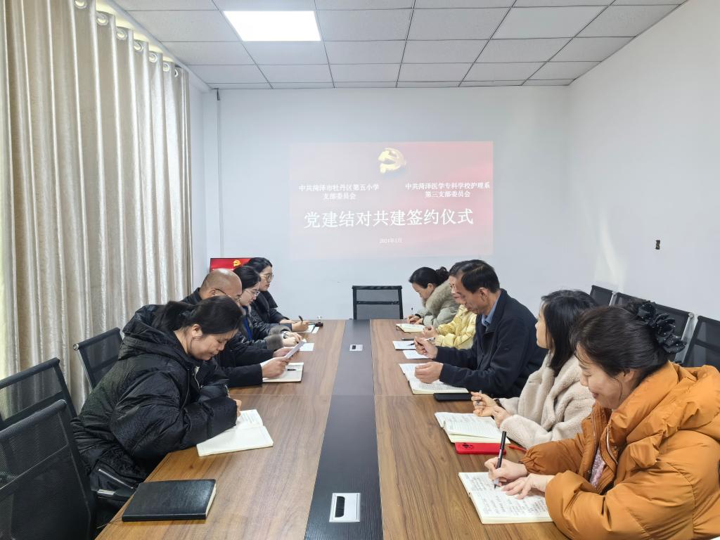 为深入学习贯彻习近平新时代中国特色社会主义思想和党的二十大精神,积极构建“资源共享、优势互补、互相促进、共同提升”的党建工作新格局,1月11日,护理系第三党支部与牡丹区第五小学党支部开展以“结对共建聚合力,党建引领促发展”为主题的党建结对共建活动。牡丹区第五小学党支部书记、校长王克锋及其党支部委员会成员,我校护理系党总支书记刘明哲、主任马国平、副书记杨珂、护理系第三党支部书记李子瑾及党员代表参加活动。