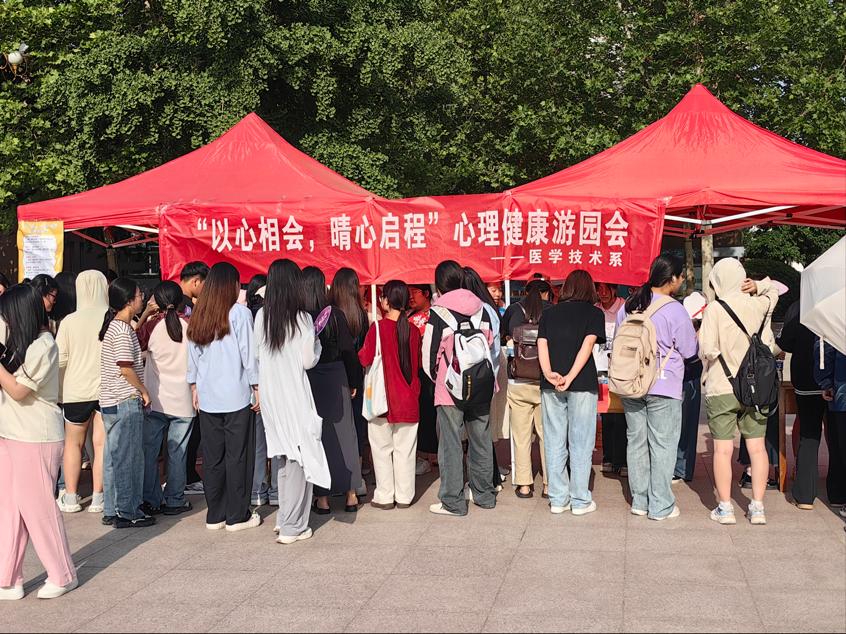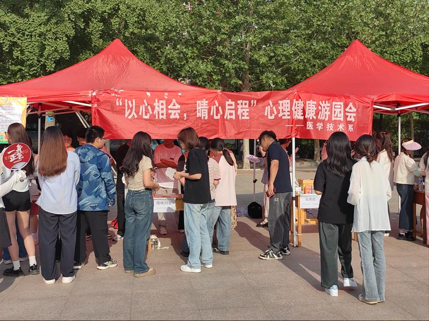 医学技术系心理健康游园会围绕“以德育心、以智慧心、以体强心、以美润心、以劳健心”开展,活动包含计时拼图、趣味问答、飞花令以及听歌识曲等小游戏,同学们踊跃报名参加,医技摊位前围满了参与活动的同学。