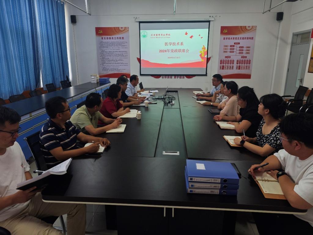 为充分发挥校领导的联络、指导作用,提高基层工作整体水平,6月19日下午,医学技术系于3号实验楼5605会议室召开2024年第五次党政联席会(扩大)会议。校党委委员、副校长李铮,系党政领导班子成员参加会议,各教研室、实验室主任及系部办公室成员列席会议,会议由党总支书记牛家峰主持。
