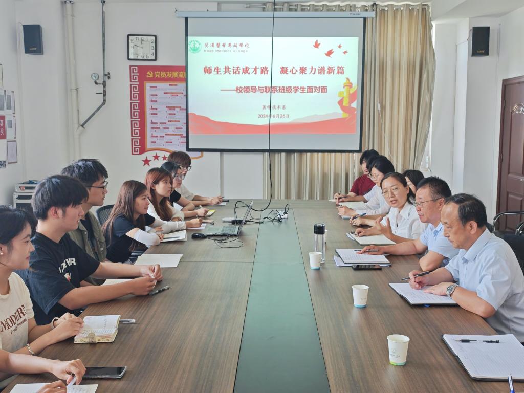 为贯彻落实学校领导深入基层联系班级工作,详细了解学生生活、学习情况,切实助力学生成长成才,6月26日上午,校党委委员、副校长齐云飞在图书楼1601室与医学技术系2023级眼视光3.4班20余名学生代表进行了面对面座谈交流。医学技术系党总支书记牛家峰、系部专职辅导员代表参加座谈。会议由联系班级辅导员牟翠荣主持。