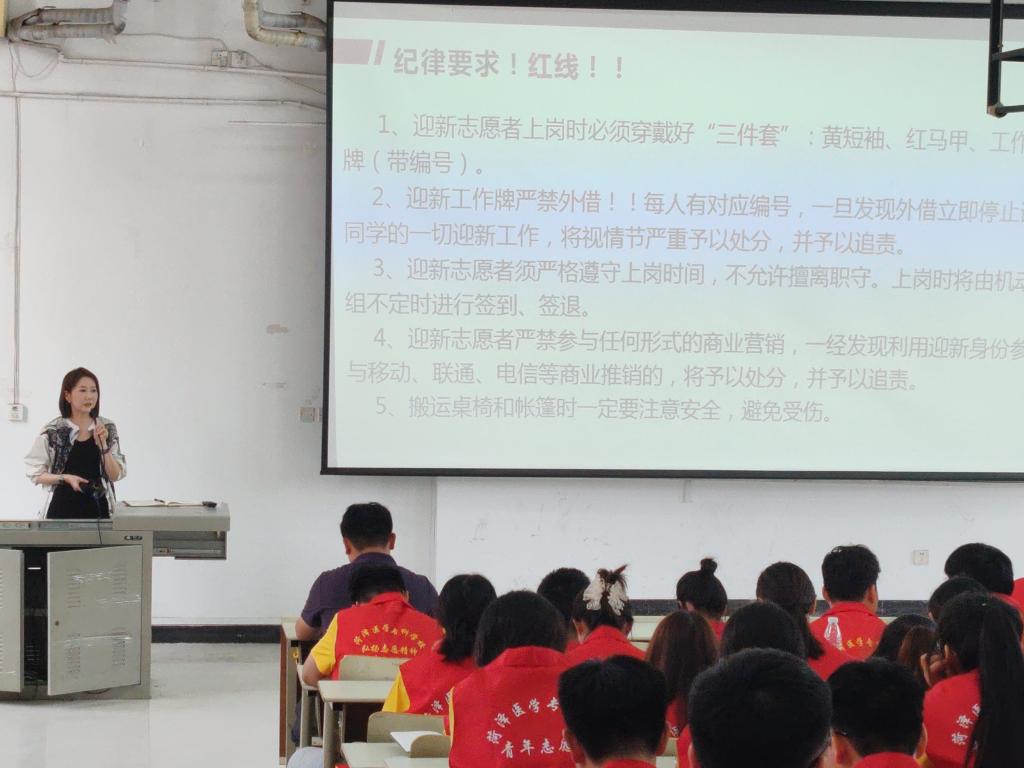 团委书记于淼作动员讲话。首先代表学校团委对每一位积极参与迎新工作的志愿者表示诚挚问候和衷心感谢,并强调迎新工作是学校的一项重要任务,迎新志愿者们作为新生融入校园的关键,希望在接下来的工作中保持热情和耐心,确保迎新工作的顺利进行。同时对志愿者们提出四点具体要求:一是提升服务质量,营造温馨氛围。开展“一对一”暖心服务,最大限度为新生和家长入校提供便利;二是统一思想,凝聚共识。以良好的精神风貌和使命感投入到迎新工作中;三是强化安全意识,筑牢安全防线。维护迎新期间校园安全和稳定;四是树立良好形象,践行使命担当。注意服务细节,做到精心接待。