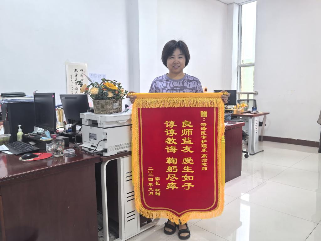 9月10日,一名学生家长将书有“良师益友,爱生如子,谆谆教诲,鞠躬尽瘁” 烙金字样的锦旗和感谢信送到护理系,真诚地表达了对护理系2021级助产班辅导员高洁老师感激之情。