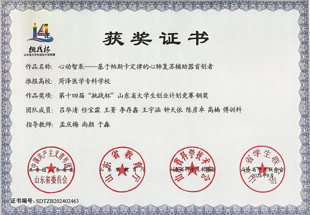 近日,由共青团山东省委、山东省教育厅、山东省科学技术协会、山东省学生联合会主办的第十四届“挑战杯”山东省大学生创业计划竞赛公布获奖情况。我校《心动智泵—基于帕斯卡定律的心肺复苏辅助器的首创者》和《护齿小先锋—鲁西南儿童口腔健康服务团》项目荣获省级铜奖。