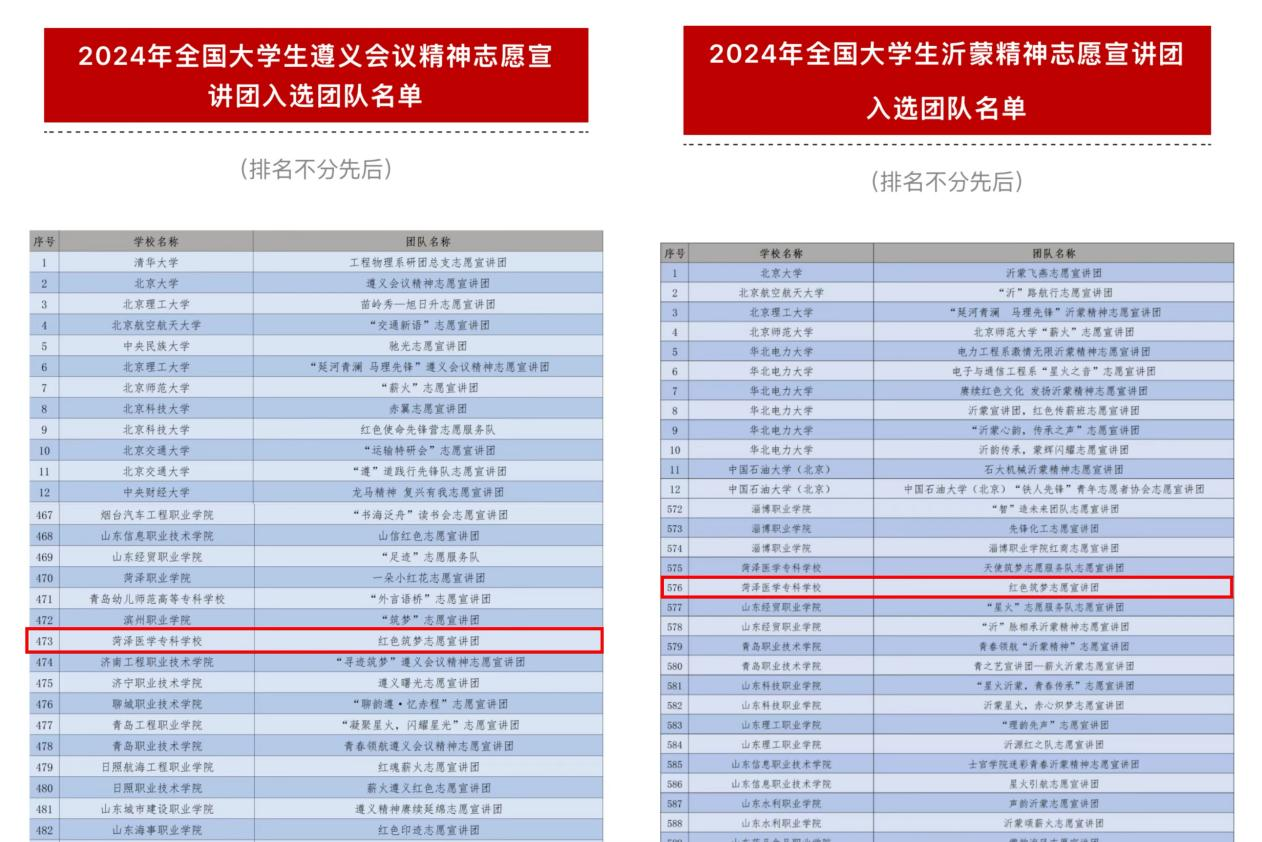 为深入学习宣传贯彻习近平新时代中国特色社会主义思想和党的二十届三中全会精神,2024年10月,团中央青年志愿者行动指导中心联合多部门发布《关于遴选全国大学生遵义会议精神志愿宣讲团》和《关于遴选全国大学生沂蒙精神志愿宣讲团》的公告。我校临床医学系的红色筑梦志愿宣讲团队凭借扎实的前期准备,成功入选全国大学生遵义会议精神宣讲团和全国大学生沂蒙精神志愿宣讲团。