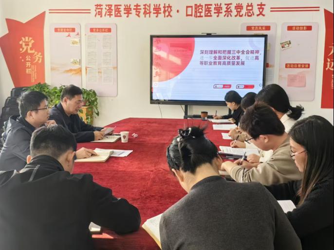 为深入贯彻落实党的二十届三中全会精神,推进高等职业教育高质量发展在学校落到实处、见到实效,11月5日下午,校党委副书记蒋继国到口腔医学系讲授二十届三中全会精神专题党课,口腔医学系第一、第二党支部党员参加学习。
