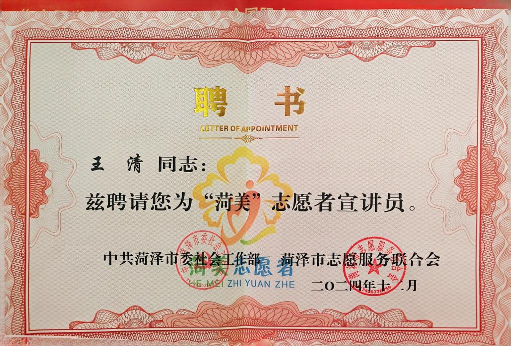 为进一步弘扬志愿服务精神,凝聚文明向善力量,展现新时代志愿服务风采。12月4日,菏泽市委社会工作部、市志愿服务联合会在菏泽学院演播厅举行“志愿微光 汇聚星河”第39个国际志愿者日主题活动启动仪式。我校医学技术系青年教师王清作主题为“守护‘睛’彩,点‘亮’未来”志愿服务项目典型宣讲,并获聘成为菏泽市首批“菏美”志愿者宣讲员。