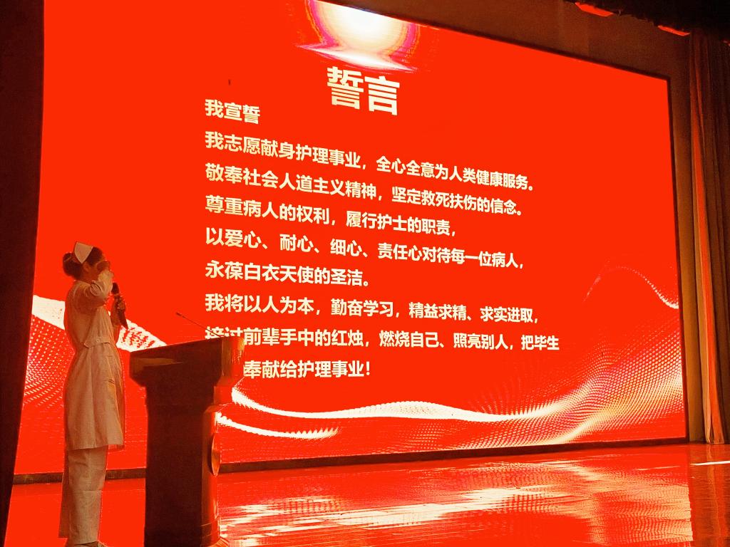 “我志愿献身护理事业,全心全意为人类健康服务。”在郭鹤老师的领誓下,全体学生高举右拳以誓言铭刻初心!铿锵誓言回荡会场,传递出护理学子守护生命、精研技能的坚定信念,将活动推向高潮。