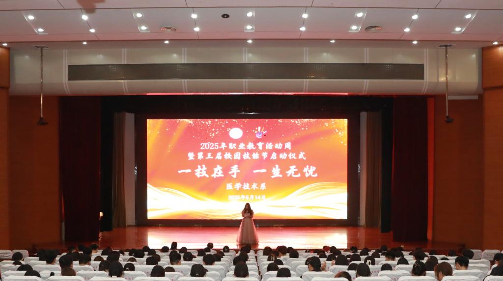 为深入贯彻落实习近平总书记关于职业教育重要指示精神,大力弘扬劳动光荣、技能宝贵、创造伟大的时代风尚,5月14日下午,2025年职业教育活动周暨医学技术系第三届校园技能节启动仪式在我校大礼堂举行。学校党委副书记蒋继国,医学技术系党总支书记牛家峰、主任戴馨、副书记牟翠荣、副主任潘炳灿及医学技术系师生参加启动仪式。