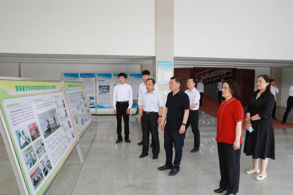 在激昂奋进的音乐声中,教师与学生代表走向舞台中央,一起按下按钮,共同开启2025年职业教育活动周。开幕式后,蒋继国和医学技术系师生步入大礼堂大厅观看我系职业教育成果展。