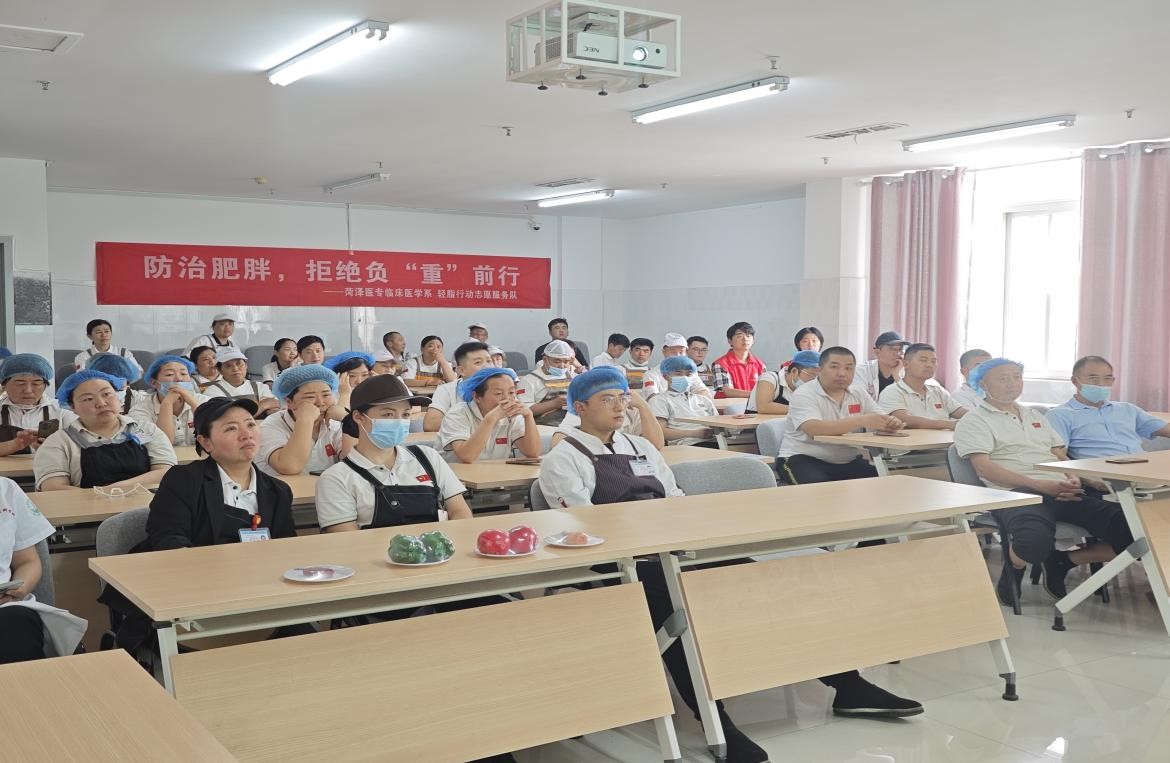 活动伊始,临床医学系冯颖老师和张雯老师以 “防治肥胖,拒绝负重前行” 为题,为餐厅职工带来了一场专业的健康宣教活动。两位老师从肥胖的诊断、危害入手,通过BMI、标准体重等公式,指导餐厅员工现场计算、评估自身体重及肥胖情况;结合食物热量分类,详细讲解了科学膳食的关键要素;通过具体的肉、奶、蛋、水果、蔬菜等食物的热量,计算每日能量需求及膳食选择;建议餐厅员工应注重食物的搭配与烹饪方式,在保证口味的同时,减少高油、高糖、高盐食物的供应,增加全谷物、新鲜蔬果的占比。培训现场,培训学员认真记录,积极提问,就肥胖与慢性病的关系展开激烈的讨论。