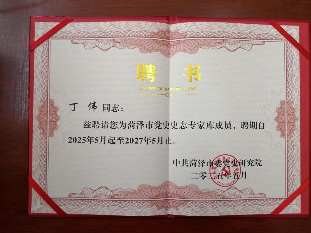 5月23日上午,马克思主义学院教师丁伟博士应邀参加由菏泽市委党史研究院召开的党史史志专家库成立大会,并被授予菏泽市党史史志专家库成员聘书。前期经学校推荐、菏泽市委党史研究院审核,全市共计有33位人员入选菏泽市党史史志专家库(第一批),我校共计有2位教师入选。