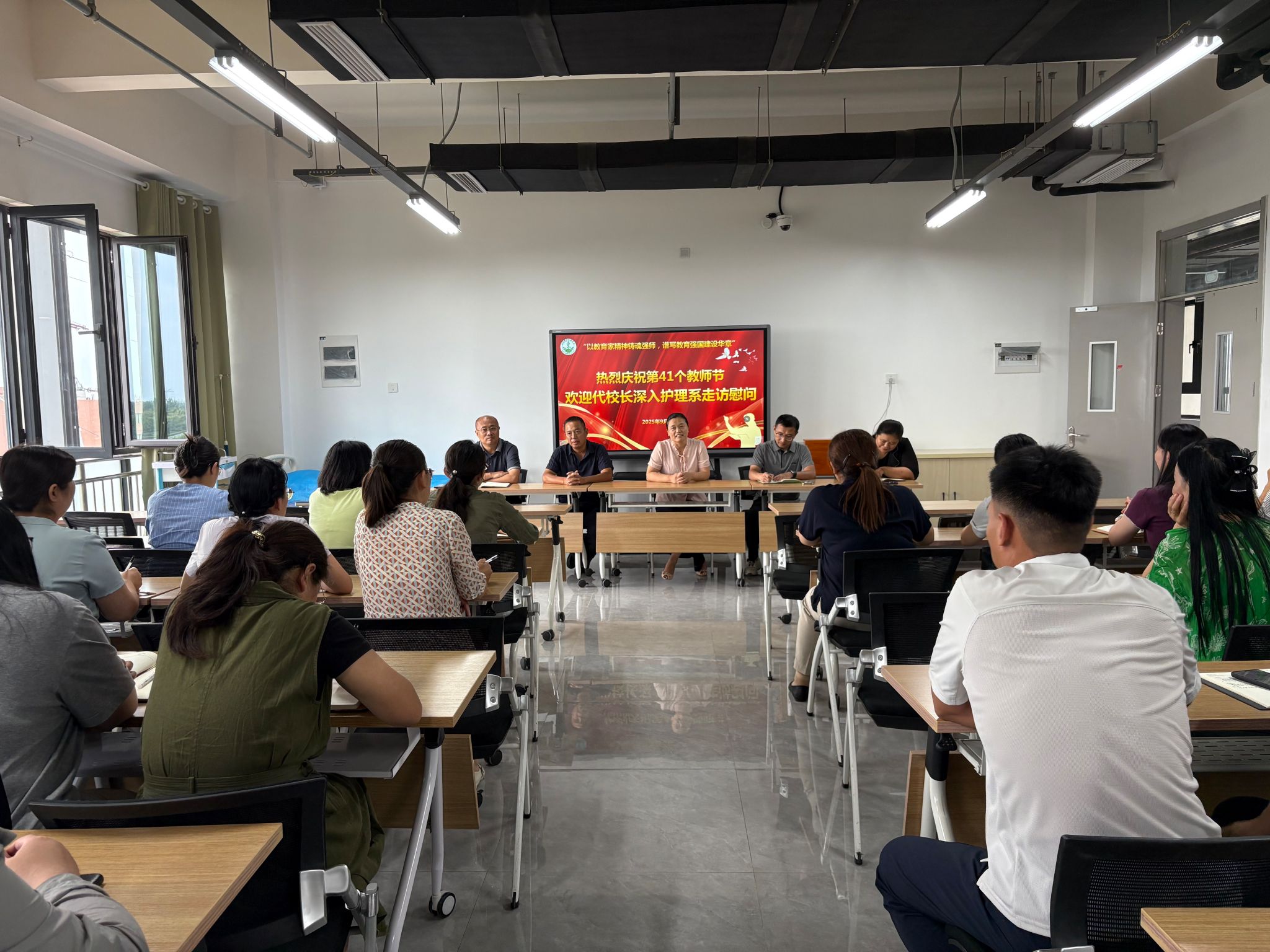 9月10日,在第41个教师节到来之际,校党委委员、副校长代爱英,安全管理处处长王安东,现代教育技术中心副主任蒋方剑一行来到护理系走访慰问全体教师,传递学校对一线教师的崇高敬意和深切关怀,并召开“以教育家精神铸魂强师,谱写教育强国建设华章”主题座谈会。护理系党总支书记刘明哲、主任马国平及全体教师共同参加活动。