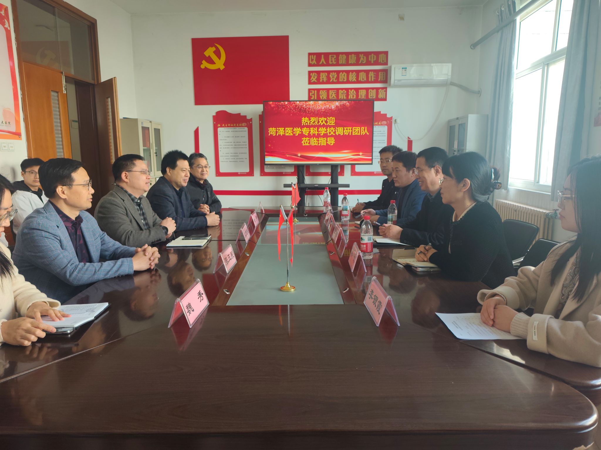 调研组先后走访单县海吉亚医院、单县中心医院、单县东大医院和东明县人民医院。座谈会上,王学贺感谢各医院对实习工作的支持,介绍学校发展规划及 2026 届毕业生情况;双方围绕合作模式升级、实习就业基地共建、人才协同培养等议题深入交流。