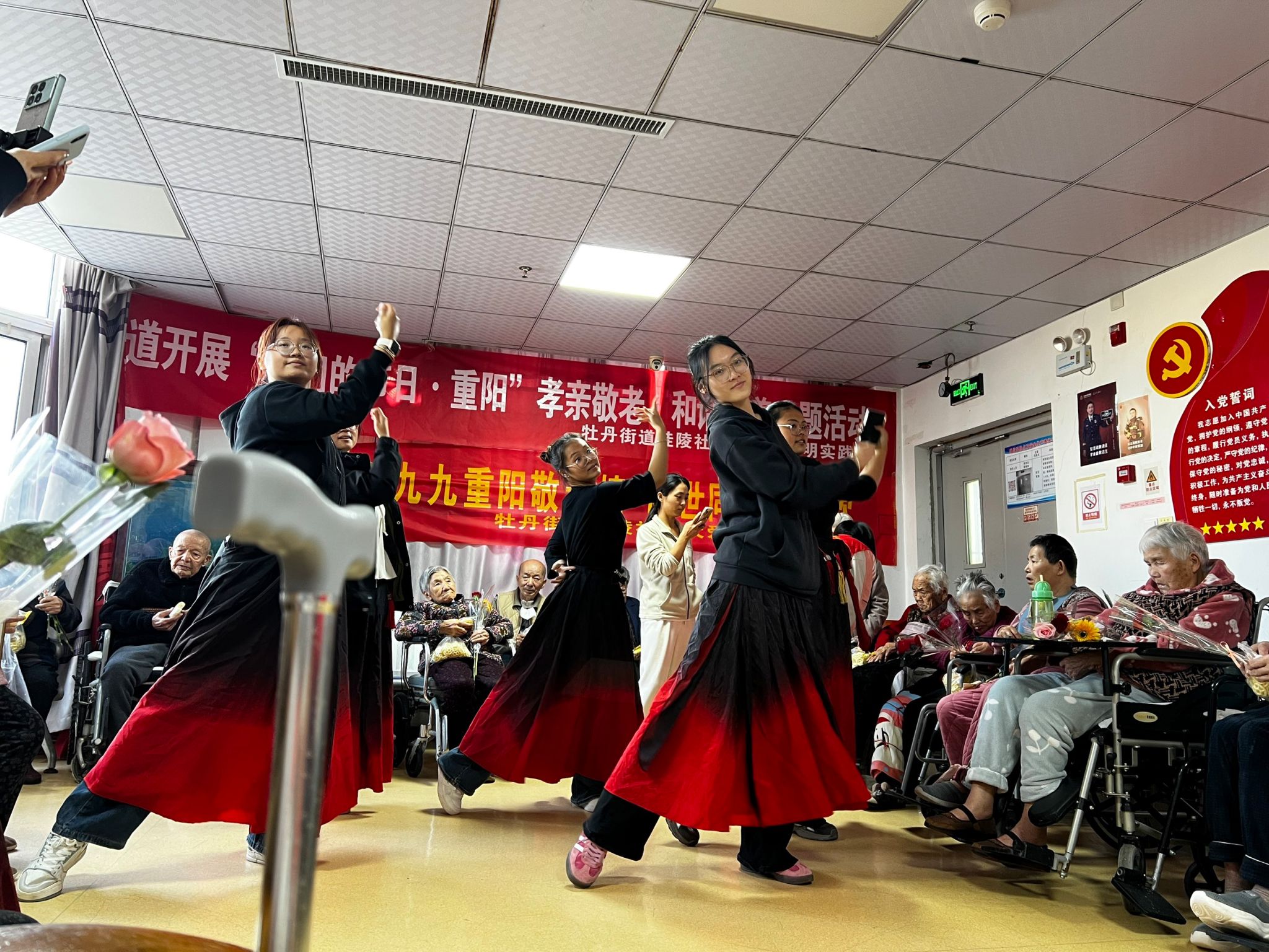 在活动现场,同学们表演了以真实案例改编的情景剧,列举常见的诈骗手段,揭秘日常中的保健品骗局,生动引导老人们识别陷阱。志愿者们帮助安装“国家反诈中心”App,并通过互动游戏来增强老人的防诈意识。随后,同学们为老人们带来温馨的演出,在欢声笑语中,青春的热情与长者慈祥的笑容交织,谱写了一曲动人的敬老乐章,传递了浓浓的温情与祝福。在表演结束后,同学们将精心准备的重阳节礼品送到每位老人手中。现场欢声笑语不绝,活动也在温馨与感动中圆满落幕,共同绘就了重阳节最动人的画面。