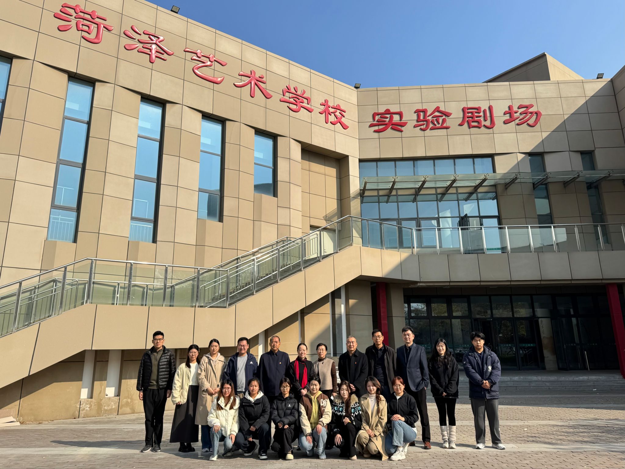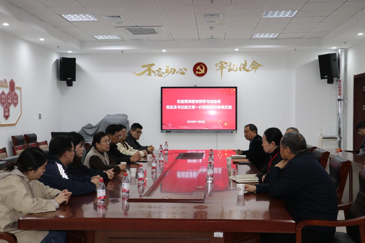 观摩结束后,双方在菏泽艺术学校党建会议室开展了党建工作座谈会。双方就党建工作经验、专业建设、文化育人等方面进行了深入交流。田文革表示,此次观摩学习让药学与检验系的师生们深受触动,菏泽艺术学校在艺术人才培养、传统文化传承方面的成果令人钦佩,希望以此次活动为契机,进一步深化两校在党建、文化、专业等领域的合作,实现资源共享、优势互补、共同发展。 菏泽艺术学校的领导也表示,期待与药学与检验系在更多领域开展合作,通过党建共建搭建起艺术与医药专业交流的桥梁,为培养复合型人才、弘扬传统文化贡献力量。活动最后,两校师生在菏泽艺术学校实验剧场前合影留念。