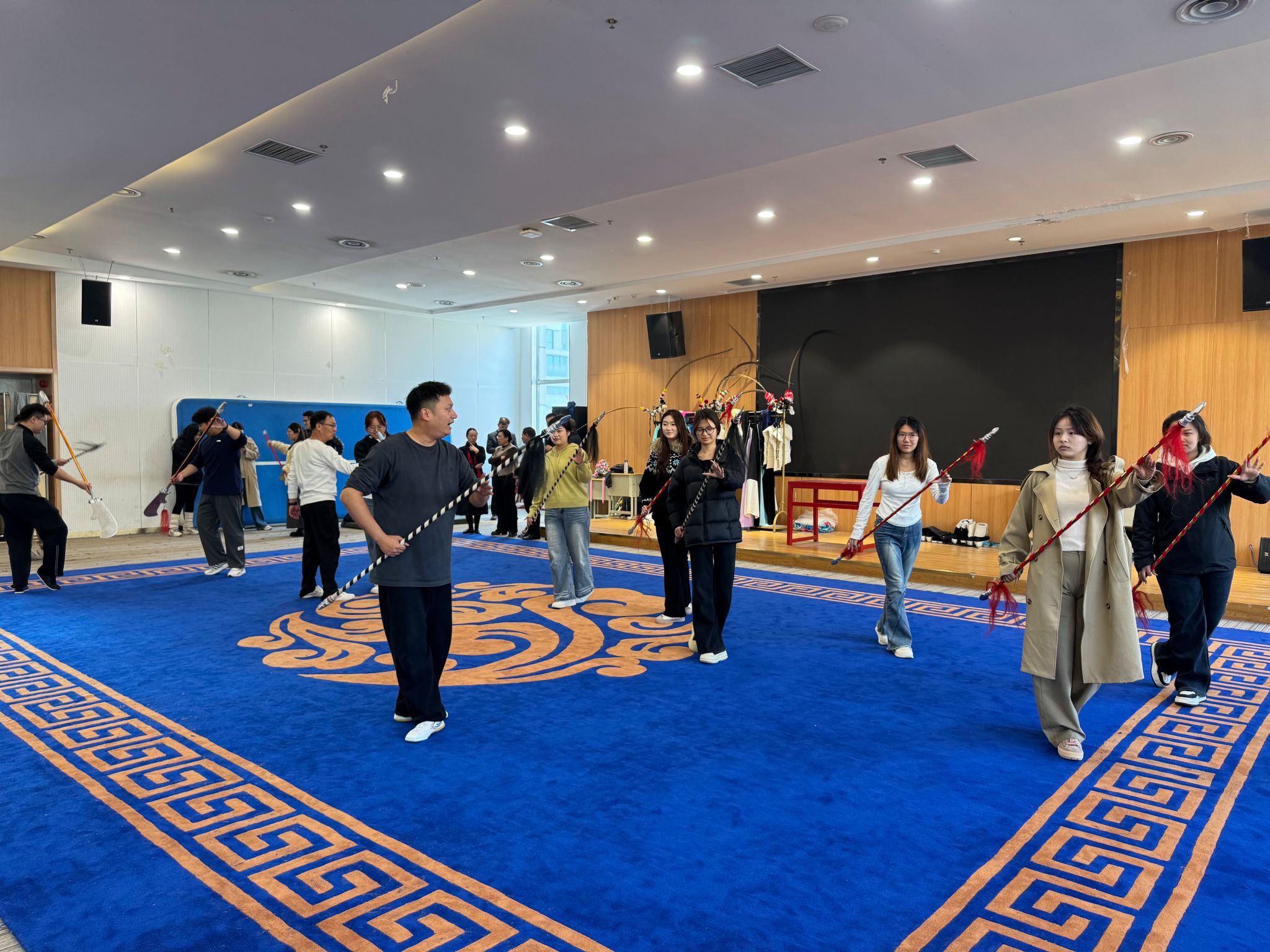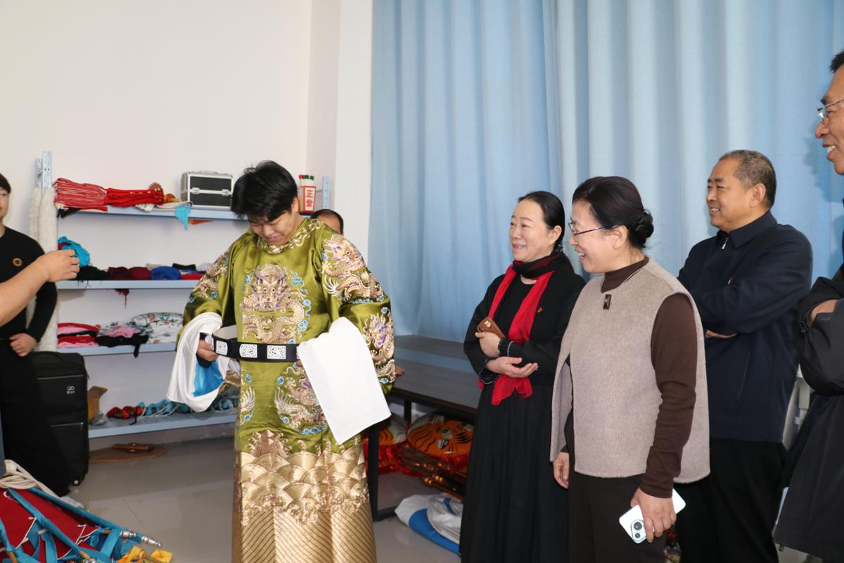 在戏曲服饰陈列室,师生们体验了戏曲服饰试穿。陈列室的货架上,各类戏曲服饰、道具琳琅满目,从精致的头饰到色彩艳丽的戏服,每一件都凝聚着传统工艺的精湛技艺。试穿过程中,艺术学校的老师详细讲解了不同服饰的角色定位、纹样寓意,让同学们在试穿体验的同时,深入了解戏曲服饰所承载的文化内涵,实现了一次跨越时空的文化对话。在戏曲排练厅,师生们观摩了一堂生动的戏曲专业课。在专业教师的指导下,文艺团的同学们尝试挥舞戏曲长枪、学习基本身段。通过近距离观察和亲身实践,大家对戏曲这门传统艺术的敬畏之心油然而生,也深刻体会到艺术传承背后的艰辛与坚守。随后,一行人还观摩了舞蹈、声乐课堂。