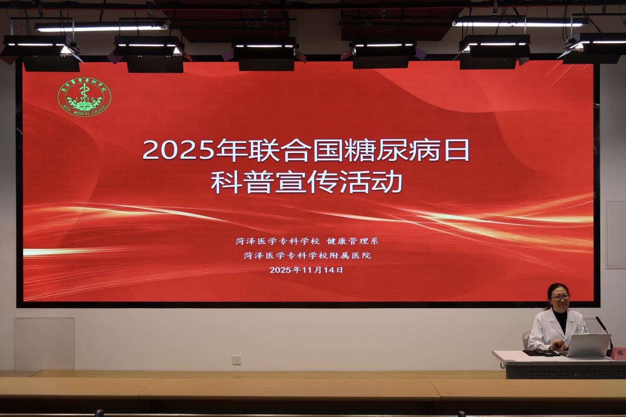 2025年11月14日是第19个联合国糖尿病日,为进一步提升学校师生对糖尿病的认知水平与防控能力,我校健康管理系联合菏泽医专附属医院内分泌科举办了以“糖尿病与幸福感”为主题的糖尿病科普宣传活动。健康管理系党总支书记李莹、副书记陈鲁曼,附属医院内分泌科副主任医师程培出席活动,师生代表300余人参与活动。