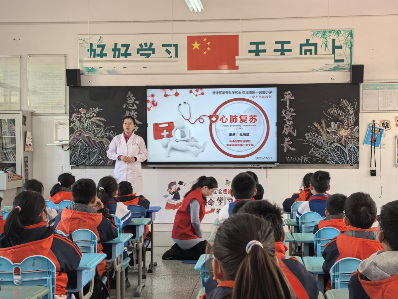 为增强中小学生应急避险与自救互救能力,11月24日,我校临床医学系刘瑞婷、张晓晨两位老师带领学生志愿者,走进菏泽市第一实验小学,为四年级300余名学生开展了以“普及急救知识,点燃希望之火”为主题的急救培训。
