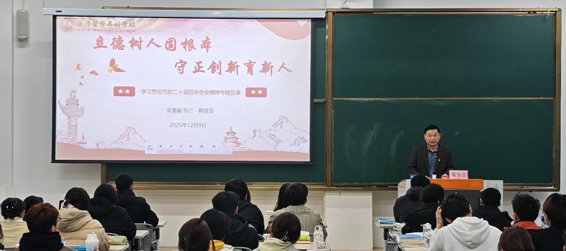 为深入学习贯彻党的二十届四中全会精神,落实立德树人根本任务。12月9日,校党委副书记蒋继国深入2025级口腔1、2班,以“立德树人固根本 守正创新育新人”为主题,讲授学习贯彻党的二十届四中全会精神专题党课。