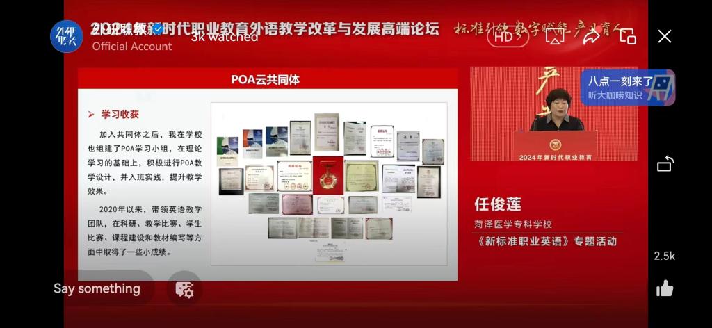 任俊莲介绍了我校的办学历史、专业设置、专业特色及取得的成绩荣誉等基本情况,重点分享了参与“产出导向法”(POA)云共同体的学习体验及收获。2020年6月-2021年12月,任俊莲加入了由“产出导向法”理论创始人文秋芳教授创建的云共同体第一期学习,通过云端,参加了25次基于任务的大班活动和无数次小组讨论,深入学习并理解了产出导向法的理论体系及应用。近几年,带领我校英语教学团队,在学习POA理论的基础上,积极进行POA教学实践,提升教学效果,在科研、教学比赛、学生比赛、课程建设、教材编写中取得了可喜的成绩。
